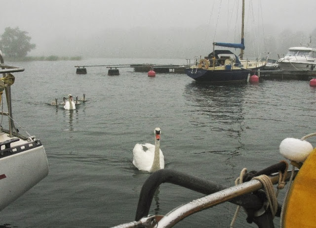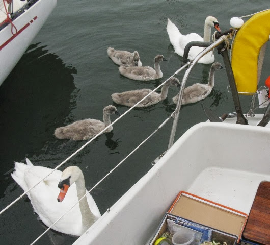 Попрощаться с нами прибыли наши друзья лебеди, всем составом. Пришлось угостить их хрустиками, т.к. из-за незапланированной ночевки даже хлеба уже не оказалось на борту:)