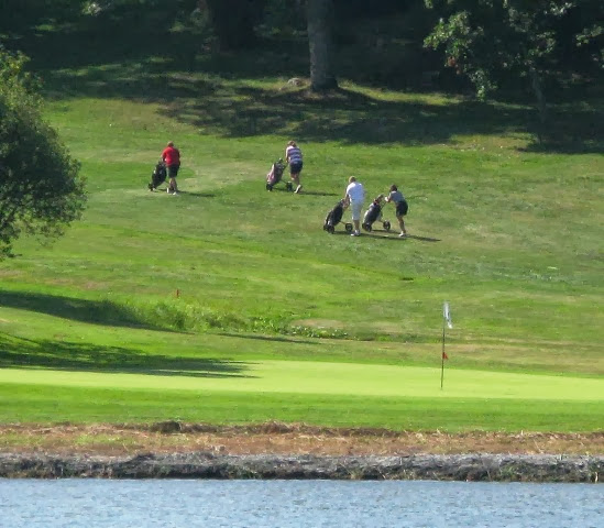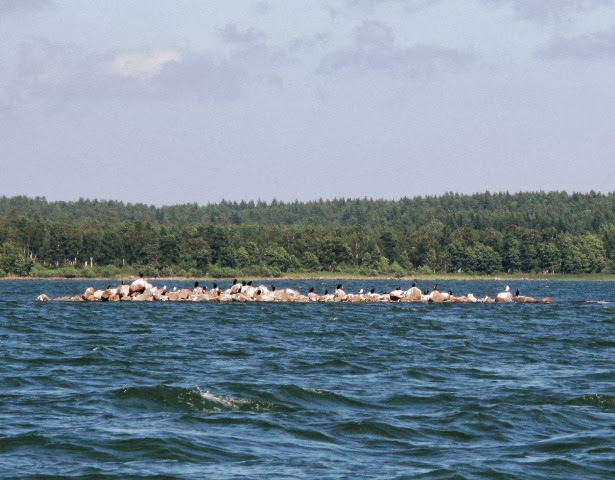 Входим в залив Кастельхольм. Красивые такие обширные луга. Все хорошо, но кто-то странно суетится на этих заливных лугах - бегает туда-сюда как таракашки, не понятно...сначала думали - может овцы? Пригляделись в бинокль - гольфисты! Их там просто тучи!